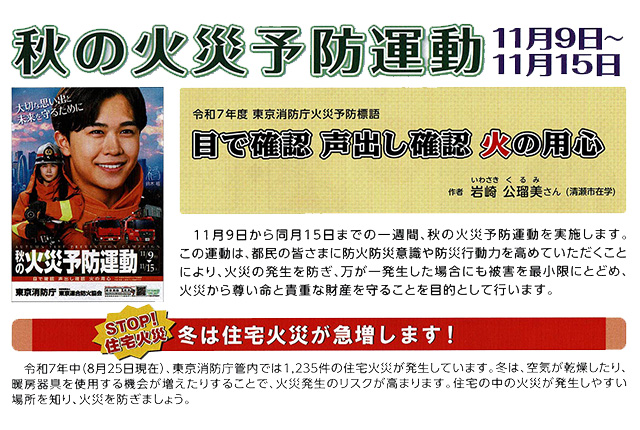 11月9日(日)から同月15日(土)までの一週間、秋の火災予防運動を実施します。この運動は、火災が発生しやすい時季を迎えるにあたって、都民の皆様に防火防災意識や防災行動力を高めていただくことにより、火災の発生を防ぎ、万が一発生した場合にも被害を最小限にとどめ、火災から尊い命と貴重な財産を守ることを目的として行います。